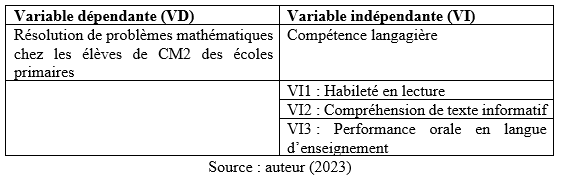 Le tableau 2 nous permet de comprendre l’opérationnalisation de nos deux variables, à savoir la variable dépendante (la résolution de problèmes mathématiques chez les élèves des CM2 des écoles primaires de l’arrondissement de Goulfey) et la variable indépendante (compétence langagière). Par ailleurs, notre variable indépendante a été opérationnalisée en trois variables, notamment l’habileté en lecture, la compréhension du texte informatif et la performance orale en langue d’enseignement.